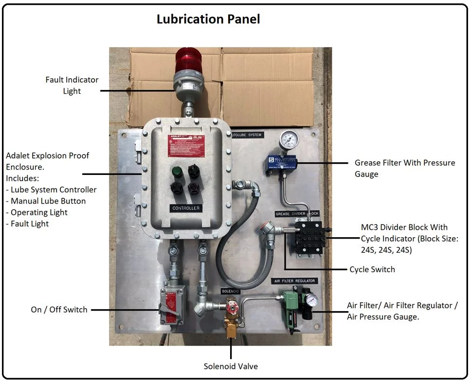 Lubrication System Controller mounted in an Adalet explosion proof enclosure: The controller has various settings, allowing the end user the ability to set the system for the specific lubrication needs of the equipment. In addition, the front of the enclosure includes a green manual lubrication button, green power light, and a red fault light. Mounted on the top of the enclosure is an additional red fault light that if lit signals that the lubrication system requires attention.